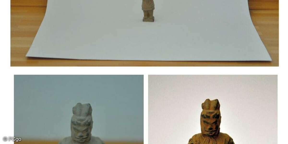 Sehr gut funktionieren hier große, einfarbige Papierbögen oder auch ein Fotokarton. Letzteren gibt es im Handel für weit unter 10 Euro in der Normalgröße 50 x 70 Zentimeter, was für 95 Prozent aller verkauften Artikel absolut ausreichen dürfte.