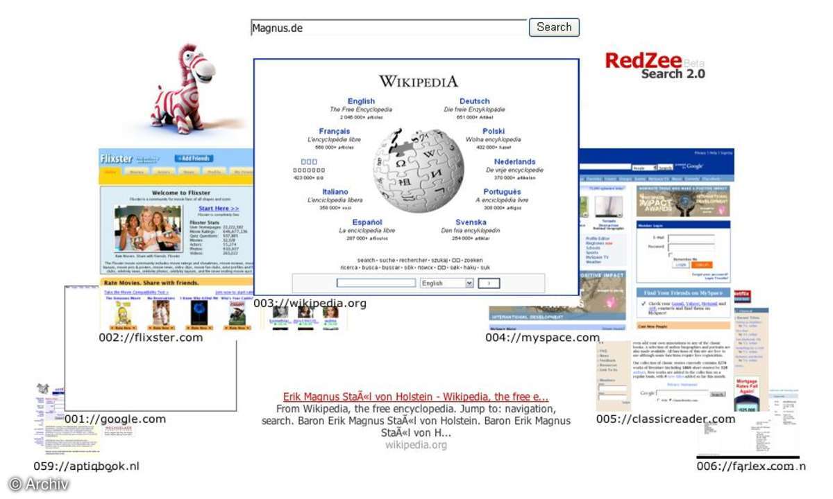 Die Web-2.0-Suchmaschine redzee zeigt ihre Suchergebnisse in einem Bilderrondell an