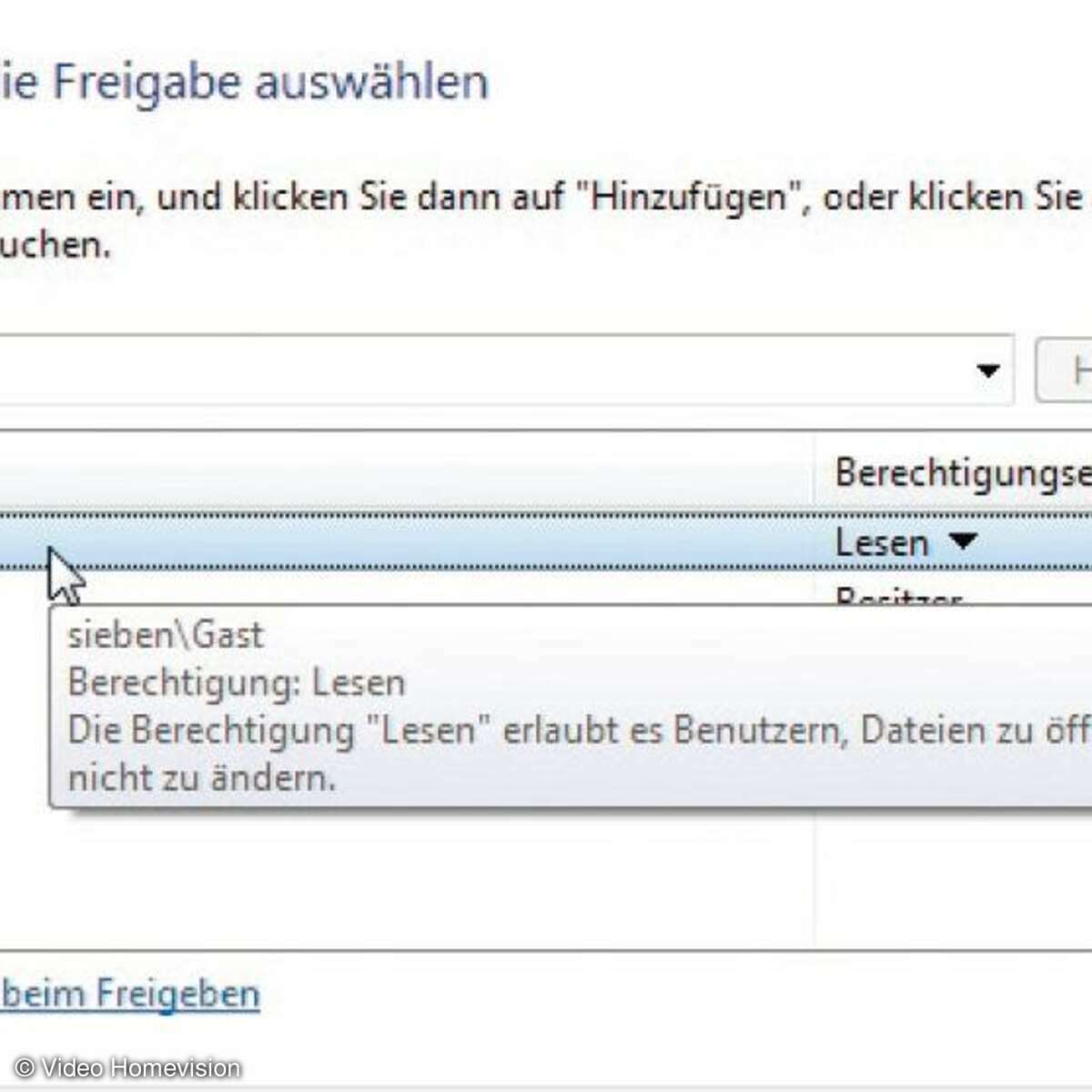 Im Fenster "Dateifreigabe" geben Sie einen Benutzernamen ein, mit dem Sie später auf den freigegebenen Ordner zugreifen wollen. Bisher haben nur Sie selbst oder der Administrator Zugriff auf den Ordner. Wichtig bei Windows 7: Für den Zugriff auf die Freigabe ist ein Benutzer auf dem PC notwendig.