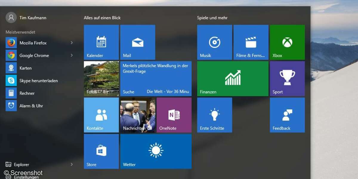 Windows 10 Screenshot: Das Startmenü
