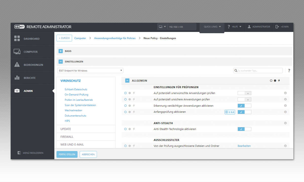 Wenn Sie nicht wollen, dass Daten Ihre Firma verlassen, ist vielleicht ein Produkt wie Eset Remote Administrator richtig. Die Verwaltungskonsole von Eset lässt sich nur lokal installieren, entweder als virtuelle Appliance oder auf einem Server. Zusätzlich gibt es ein Installations-Tool, das die Clients per Push-Installation verteilt. Die Client-Software ähnelt von der Oberfläche den Retail-Produkten von Eset.