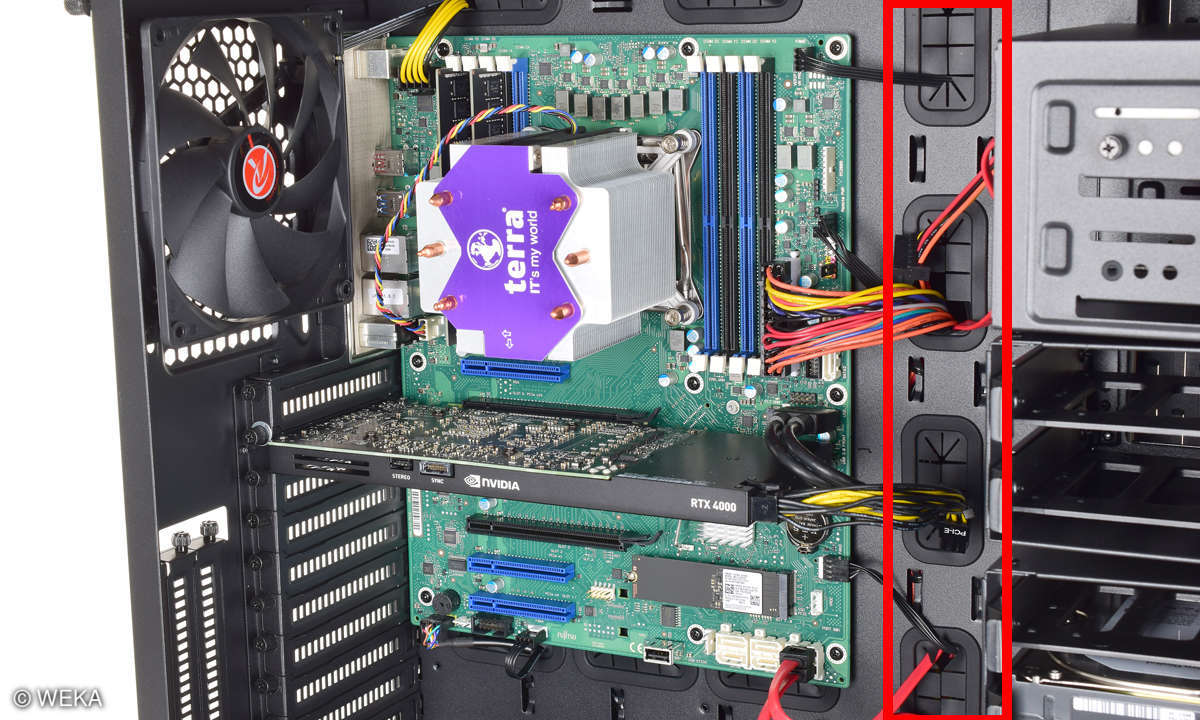 Die Terra Workstation 7800BTO ist mit ihren gut 21 Kilogramm Kampfgewicht und Abmessungen von 24,5 x 59,8 x 61,7 Zentimetern eine äußerst eindrucksvolle Erscheinung. Das Gehäuse ist sehr robust und gut verarbeitet, die Kabel sind perfekt verlegt.