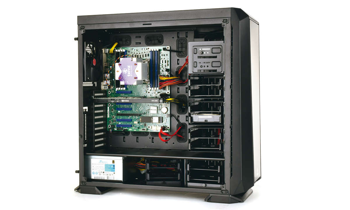 Als Grafikkarte kommt eine Quadro RTX4000 von Nvidia zum Einsatz, die ebenfalls bei professionellen Aufgaben am besten zeigt, was in ihr steckt. In unserem BTO-Testgerät war, im Gegensatz zur regulären Version des Rechners, zusätzlich zur SSD mit 512 GByte Kapazität noch eine Festplatte mit einem TByte Kapazität verbaut. Insgesamt verfügt das für den industriellen Einsatz entwickelte Fujitsu-Mainboard D3598-B mit Intel-C422-Chipsatz über acht RAM-Einschübe, von denen lediglich zwei mit jeweils Acht-GByte-Modulen bestückt waren. Alles in allem kann der Chipsatz 512 GByte Hauptspeicher verwalten, also das Vierfache von dem, mit dem ein Z390-Chipsatz für Core-CPUs maximal fertig wird. Auch sonst ist im großen Gehäuse jede Menge Platz für Erweiterungen wie beispielsweise Festplatten: Davon können insgesamt zehn Stück über entsprechende Einbaurahmen nachgerüstet werden