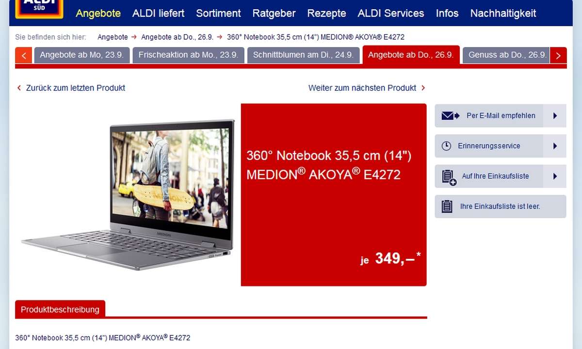 Aldi Süd hat ab 26. September den Medion Akoya E4272 für 349 Euro im Angebot. Ob sich der Laptop lohnt, erfahren Sie in unserem Schnäppchen-Check.