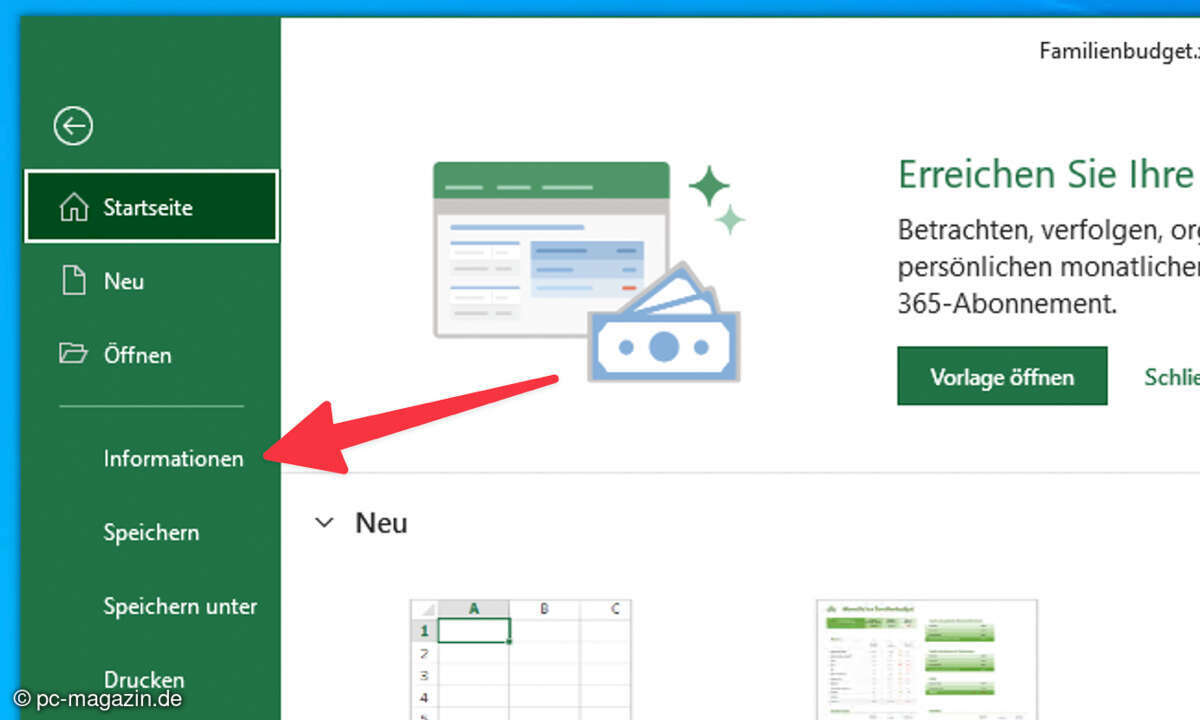 2. Klicken Sie in Microsoft Excel wieder auf "Datei" und dann auf "Informationen".