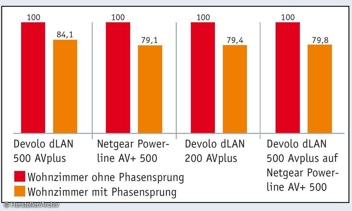 Die Kopplung ist laut Marktführer Devolo so effizient, dass die Verwendung der oftmals gepriesenen Phasenkoppler keinen weiteren, nennenswerten Gewinn bringt. Wir haben diese Behauptung überprüft, indem wir bei unseren Messungen im Wohnzimmer die Phasen getauscht haben.