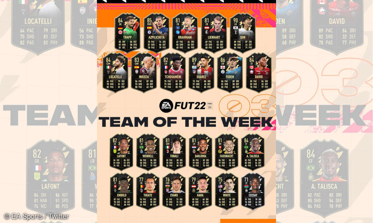 Mit dem Team der Woche – auch als TDW oder TOTW bezeichnet – würdigt EA jede Woche starke Leistungen des letzten Spieltages mit einer verbesserten Karte des jeweiligen Fußballers. Diese Upgrades bei den Werten sind permanent, zudem können Spieler im Laufe einer Saison mehrere dieser TDW-Karten erhalten, die wiederum auf den Vorgänger aufbauen.