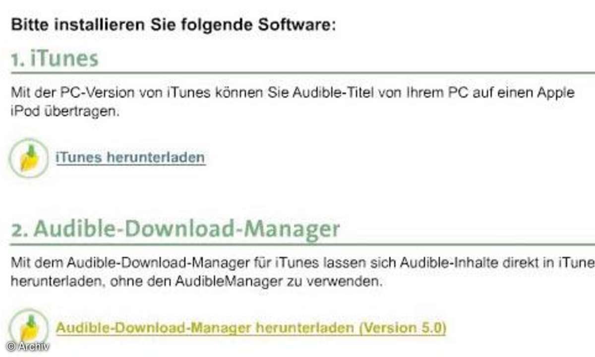 Setzen Sie also als iPod-Fan zum Verwalten Ihrer Musiksammlung iTunes ein, laden Sie den Audible-Download-Manager für iTunes herunter. Am einfachsten finden Sie ihn über den Navigationspunkt "Häufig gestellte Fragen" und "Welche Hard- und Software braucht man".