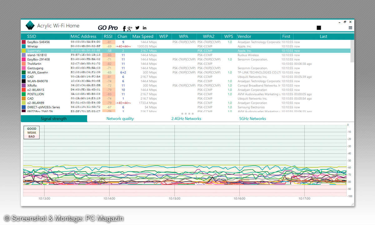 Surfen Sie dort keinesfalls ohne ein Sicherheitsfeature, wie etwa eine VPN-Software, und überprüfen Sie das WLAN-Netz mit einem Scanner wie Acrylic WiFi Home. Dieses Tool listet alle empfangbaren WLAN-Netze auf, zeigt die Geschwindigkeit und Signalstärken an sowie die verwendete Verschlüsselung.