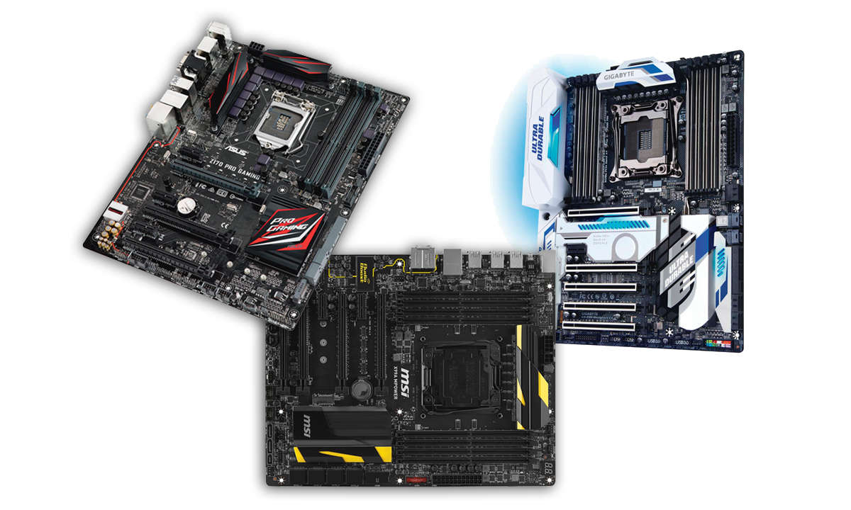 Den bezahlbaren Highend-Bereich dominieren Intels vierkernige Skylake-Prozessoren der i7- und i5-Familie sowie die dazu passenden Mainboards mit Z170- und H170-Chipsatz. Die offiziell übertaktbaren K-CPUs für den Sockel 1151 machen aber nur mit einem Z170-PCH Sinn, denn nur er bietet die Übertaktungsoption. In der Regel statten die Hersteller Z170-Mainboards mit Multigrafikartenunterstützung in den Konfigurationen mit zwei 16x-, zwei 8x-, drei 8x- oder vier 8x-PCIe-3.0-Slots aus. HDMI und -DVI-Ausgänge sind meist ebenfalls vorhanden. Außerdem stehen vier DDR4- oder DDR3-Speicherbänke und ein M.2- Slot (PCIe 3.0) für ultraschnelle M.2-SSDs sowie meist sechs SATA-3.0- (RAID) und drei USB-3.0-, zwei USB-2.0-Ports, einmal USB 3.1 und Gigabit-LAN zur Verfügung.