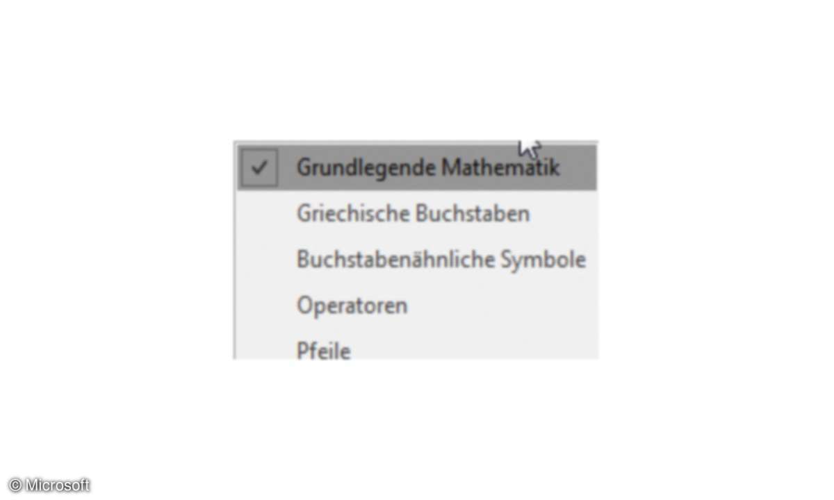 Was schnell übersehen wird, sind die erweiterten Auswahlmöglichkeiten der mathematischen Symbole. Klicken Sie in der Gruppe Symbole auf den Pfeil Weitere, dann werden nicht nur weitere Symbole eingeblendet, sondern im oberen Fensterbereich befindet sich ein Auswahlmenü mit den Kategorien.