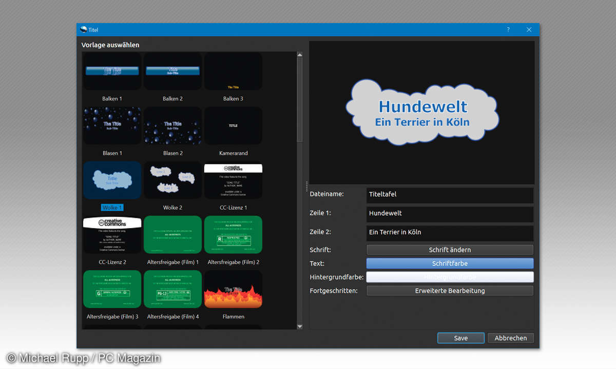 Markieren Sie links eine der Vorlagen und legen Sie rechts den Text und die gewünschte Formatierung fest. Dateiname ist der Name, unter dem der Generator die fertige Texttafel im Projektbereich ablegt. Von dort aus ziehen Sie sie anschließend an den Anfang oder das Ende der ersten Videospur – je nachdem, ob der Text Titel oder eine Abspanntafel sein soll. Die Anzeigedauer verlängern Sie durch Breiterziehen der rechten Begrenzungslinie auf der Videospur.