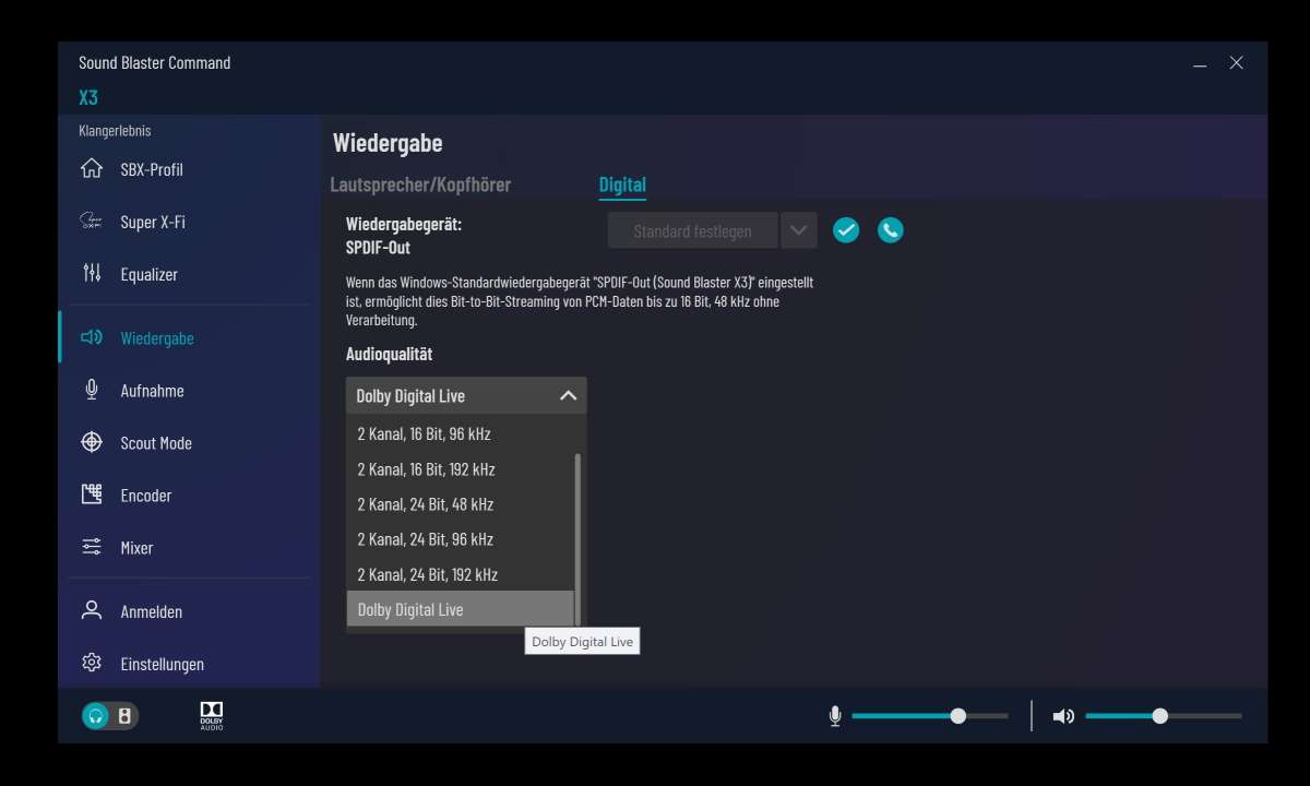 In beiden Fällen gestaltet sich die Einrichtung sehr einfach. Laden Sie die Software Sound Blaster Command herunter. Nach der Installation und dem Start wählen Sie unter Wiedergabe den Reiter Digital aus, setzen den Digitalausgang auf Standard und entscheiden sich je nach Soundkarte für Dolby Digital Live oder DTS Connect.