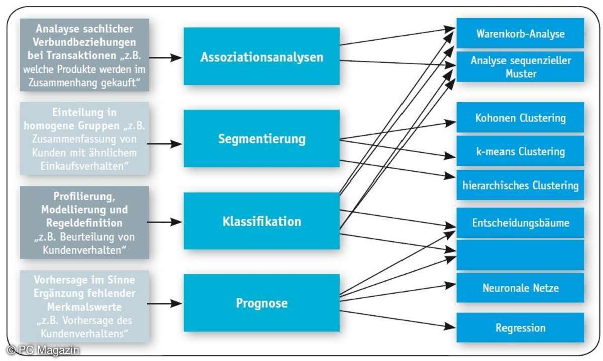 Die Grafik unten zeigt zusammenfassend einige beispielhafte Fragestellungen und hier vorgestellte bzw. speziellere Data-Mining-Verfahren, mit denen sie beantwortet werden können.