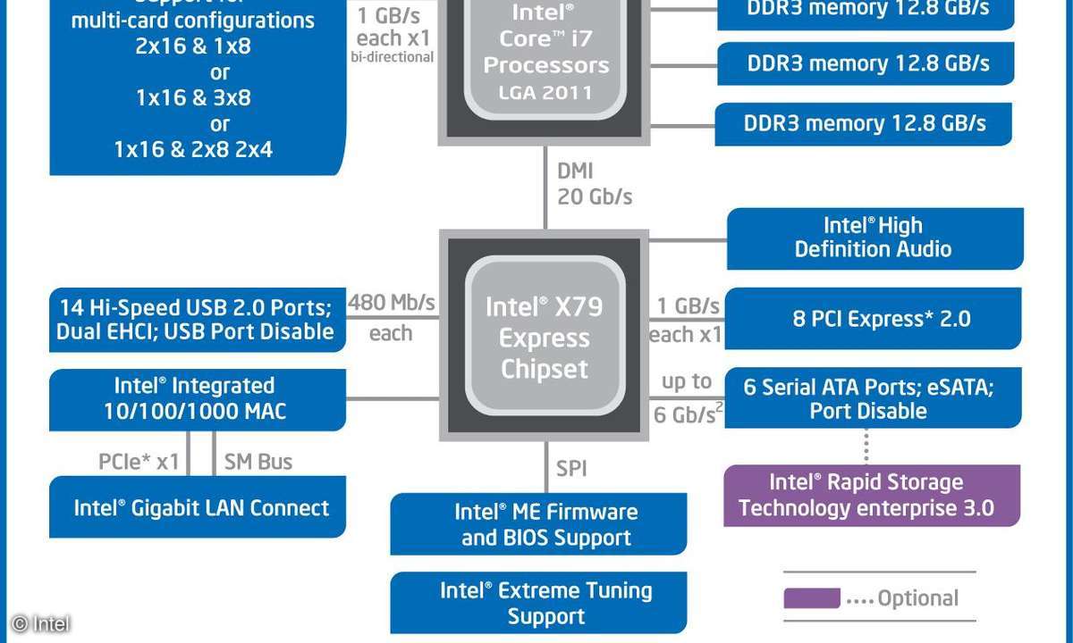 Intel hat für die Sandy-Bridge-Extreme-CPUs einen neuen Sockel mit 2011 Kontakten eingeführt. Die zusätzlichen Pins sind für die PCIe-Lanes und die vier Speicherkanäle notwendig, einer mehr als bei den Vorgängern der 900er-Serie. Der 32-Nanometer-Prozessor selbst ist in der Hexacore-Variante mit einer Die-Fläche von 435 mm² und 2,27 Milliarden Transistoren mehr als doppelt so groß wie der "kleine" Sandy Bridge. Und er ist größer als der nun ebenfalls in einem 32-Nanometer-Prozess hergestellte FX von AMD. Der besteht aus etwa zwei Milliarden Transistoren auf einer Fläche von 315 mm². Da der PCIe-Controller in die CPU gewandert ist und der Prozessor für Single-CPU-Systeme bestimmt ist, konnte Intel beim Sandy Bridge Extreme auf den QPI-Link des Vorgängers verzichten. Der für die neue CPU entwickelte X79-Chipsatz besteht auch nur noch aus einem Chip. Er übernimmt die Aufgaben der früheren Southbridge und kommt mit deutlich weniger Energie aus, als das frühere Duo aus X58 und ICH10. Ein USB-3.0-Controller fehlt auch beim X79 und von den sechs SATA-Ports unterstützen auch nur zwei Datentransfers mit 6 GBit/s. Die acht PCIe-2.0-Lanes sind primär für Zusatzchips wie Ethernet-Controller, USB-3.0-Bausteine oder SATA-Chips bestimmt.Die ersten Mainboards mit Sockel 2011 für den Sandy Bridge Extreme sind bereits auf dem Markt. Neben Intel haben Asus, Gigabyte und MSI passende Platinen mit Intel X79-Chipsatz für den High-End Core i7 vorgestellt.
