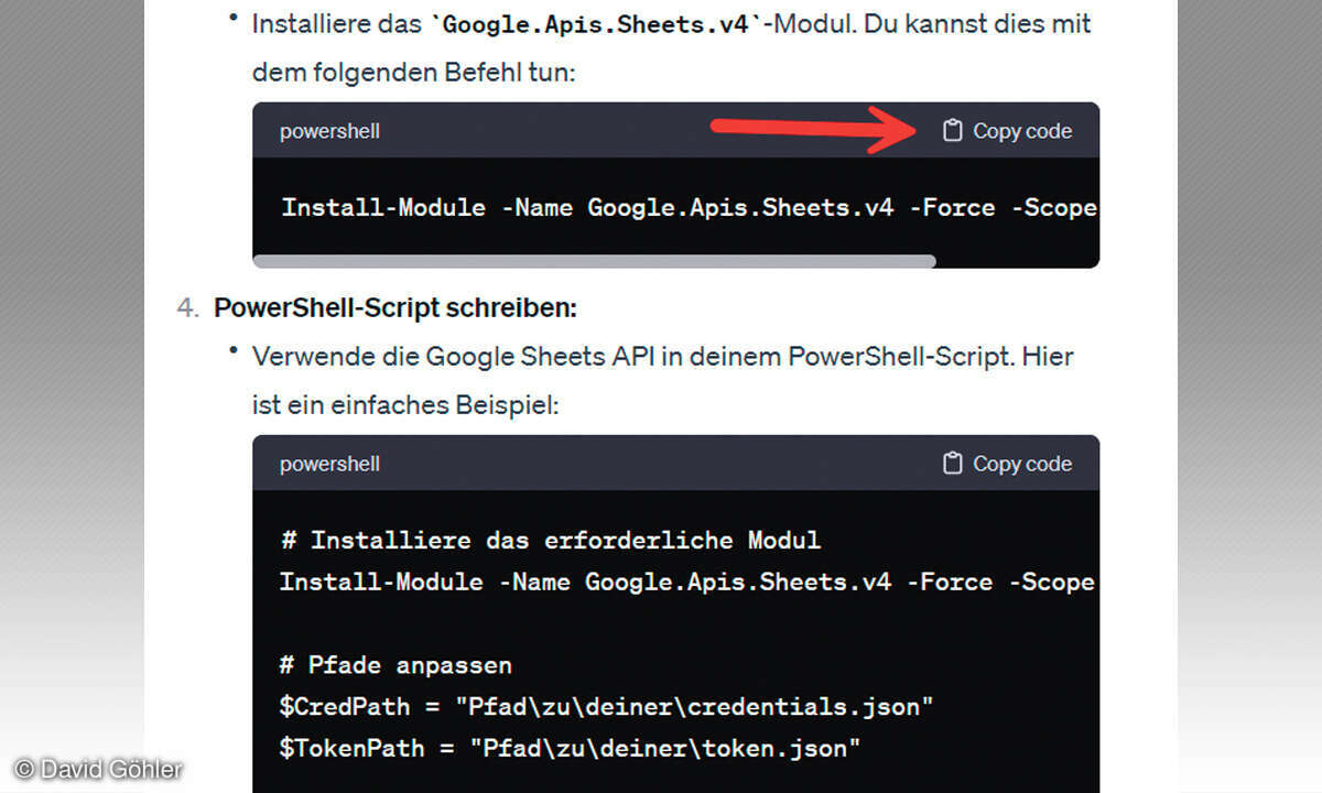 Dabei setzt ChatGPT die Antwort automatisch in einen schwarzen Kasten, der rechts den Button Copy Code enthält. Er kopiert den Inhalt in die Zwischenablage, um sie einfach wieder in die PowerShell oder einen Editor einfügen zu können.