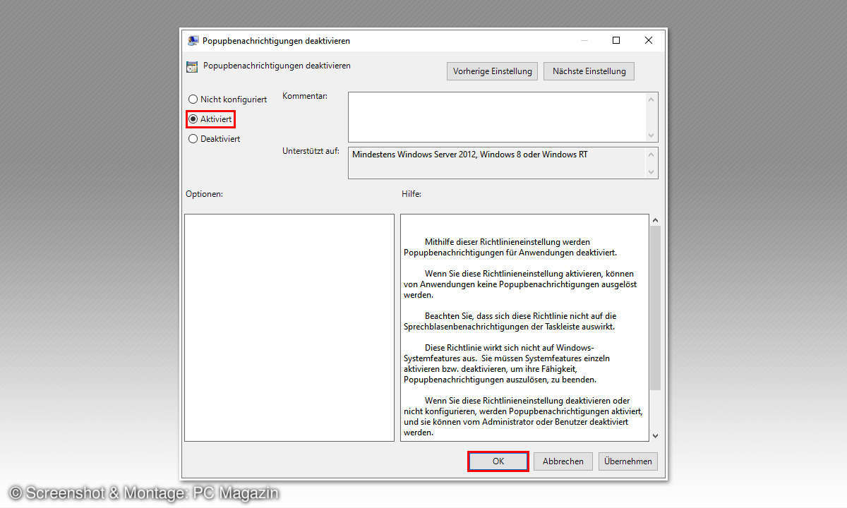 - Aktivieren Sie im erscheinenden Dialogfeld das Optionsfeld bei Aktiviert. Schließen Sie das Dialogfeld Pop-up-Benachrichtigungen deaktivieren danach per Klick auf die OK-Schaltfläche.