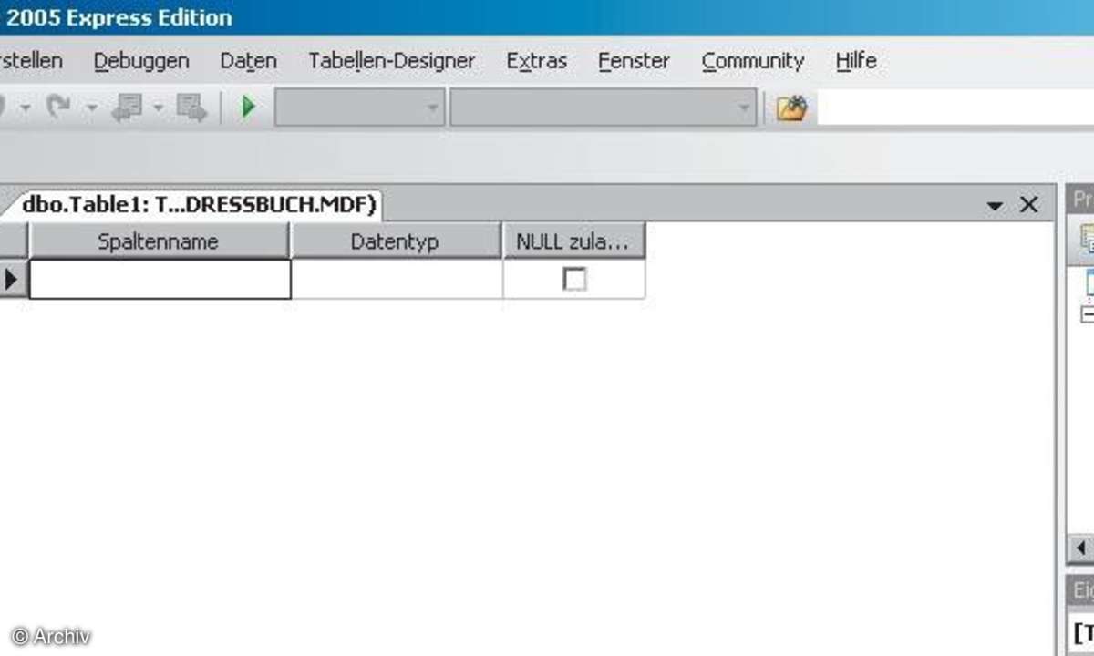 Der Datenbank-Explorer zeigt eine Übersicht aller Datenbankelemente und stellt per Kontextmenüs eine Reihe wichtiger Funktionen zur Verfügung. Sie können ihn jederzeit über das Menü Ansicht/Weitere Fenster/Datenbank- Explorer aufrufen. Zwar benötigt die SQL-Datenbank im Beispiel nur eine einzige Tabelle. Bei Bedarf integrieren Sie natürlich mehrere Tabellen mit Primär- und Fremdschlüsseln. Für komplexe Aufgaben können Sie Ihrem Projekt sogar mehrere SQL-Datenbanken hinzufügen. Daher erscheinen die Datenbankverbindungen im Datenbank-Explorer auch als Baumstruktur. Im mittleren Fenster sollte nun der so genannte Tabellen- Designer und oberhalb eine neue Symbolleiste erscheinen.