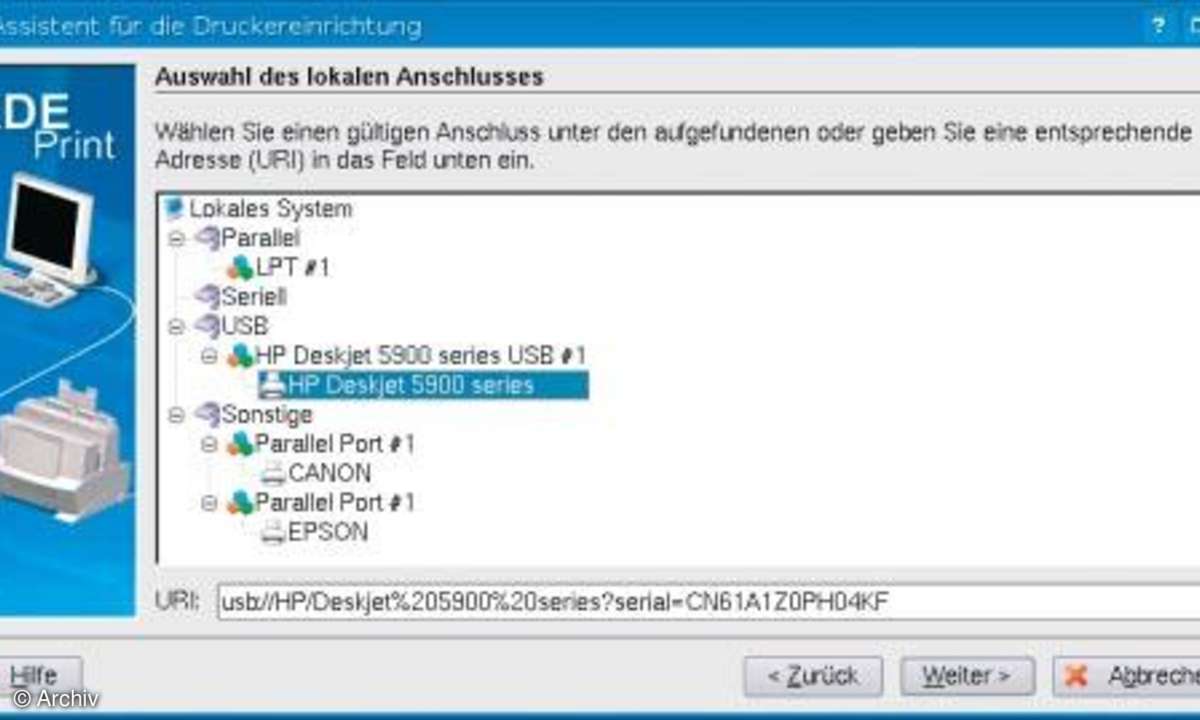 Wenn Ihr Drucker eingeschaltet ist, wird er in der Liste stehen. Markieren Sie ihn und klicken Sie auf Weiter. Trotzdem müssen Sie im nächsten Schritt Hersteller und Modell auswählen. Danach können Sie ihn testen und noch einige Einstellungen vornehmen, zum Beispiel die Größe von Dateien, die gedruckt werden dürfen, beschränken. Zum Abschluss müssen Sie dem Drucker einen Namen geben, KDEPrint listet alle Einstellungen noch einmal auf und Sie bestätigen mit Abschließen.