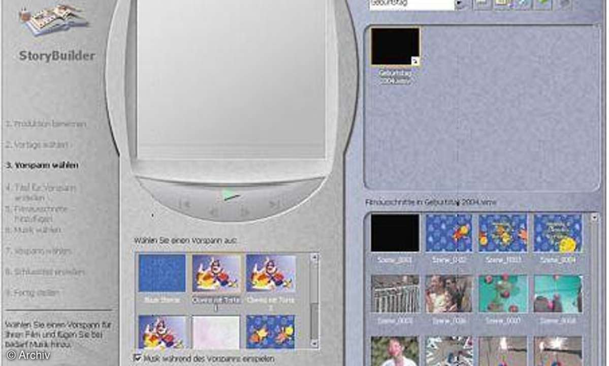 Aus dem importierten Videomaterial stellen Sie rasch einen Film mit Titel, Musik und Abspann zusammen. Auch hier hilft ein Assistent....