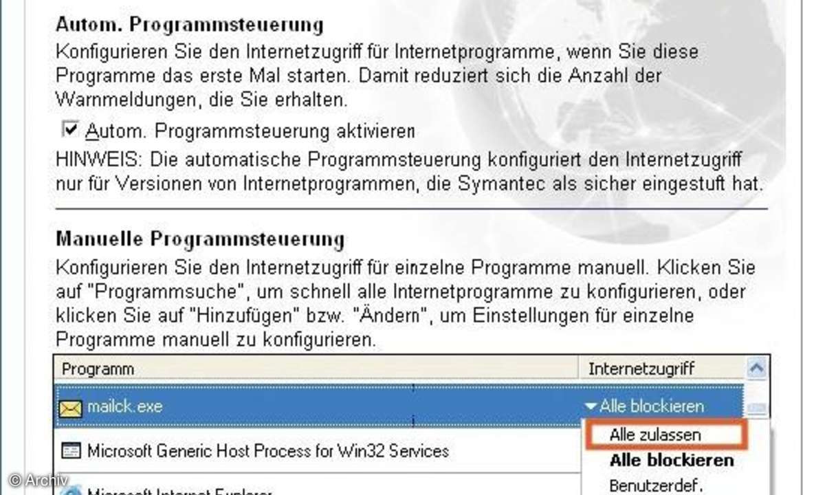 Findet keines der Sicherheits-Tools eine schädliche Komponente, können Sie die entsprechende Anwendung in den Firewall-Einstellungen wieder zulassen. In der Norton Personal Firewall finden Sie die Liste aller registrierten Online-Anwendungen unter "Status & Einstellungen/ Persönliche Firewall/Konfigurieren/Programmsteuerung".