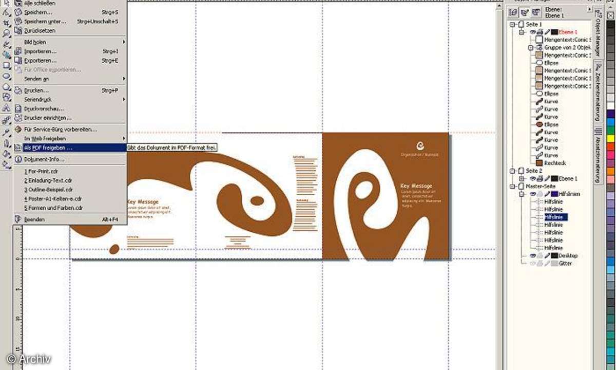Geben Sie Ihre Datei an eine Druckerei, sprechen Sie sich rechtzeitig vorher ab, da die Anforderungen variieren. Für die Druckdatei gehen Sie zu Datei/Als PDF freigeben in der Menüleiste. Ins Druckmenü gelangen Sie über einen Klick mit der rechten Maustaste auf den Button Einstlg.. Wählen Sie PDF-Stil/PDF für Druckvorstufe. Klicken Sie im Reiter Objekte auf Allen Text als Kurven exportieren. Klicken Sie auf den Reiter Druckvorstufe, hier auf Randanschnittgrenze und auf Schneidemarken. Gehen Sie zum Reiter Erweitert. Bestätigen Sie die Standardeinstellungen mit OK.
