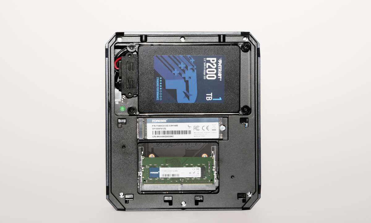 Der Blackview lässt sich sehr einfach über das Entfernen von zwei Schrauben erweitern. In unserem Testmuster fanden wir lediglich ein 16 GByte SO-DIMM-Modul vor, welches man bei Gelegenheit um ein weiteres 16 GByte-Modul komplementieren könnte. Außerdem ist Platz für eine herkömmliche SSD im 2,5-Zoll-Format.
