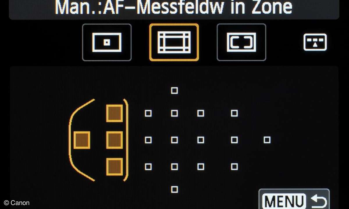 Ein wenig verwunderlich ist, dass Canon unter den AF-Methoden im Live-View nach wie vor auch den "Quick-Modus" mit 19-Punkte-AF und Dunkelpause beim Scharfstellen anbietet - angesichts des schnellen Sensor-AFs eigentlich verzichtbar. Der Sensor-AF lässt sich als Mehrfeld- und Einzelpunkt-Autofokus konfigurieren oder mit Gesichtserkennung inklusive AF-Verfolgung verwenden.