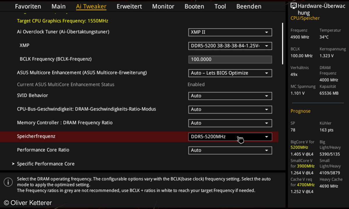 Für den Test wählen wir das vom Mainboard angebotene XMP II Profil, welches und die maximale Geschwindigkeit von 5200 MHz ermöglicht und die Spannung von 1,1 auf 1,25 Volt erhöht. Mehr verändern wir nicht. Dabei sollte aber nicht unerwähnt bleiben, dass Asus in seinen Grundeinstellungen ein wenig Tuning vom BIOS aus betreibt, quasi mit den Grundeinstellungen. Das ist okay für uns, da hier nicht wirklich weit gegangen werden kann. Das Testsystem ist mit keinem CPU-Wasserkühler ausgerüstet und die von Asus betriebene Übertaktung ist abhängig von der Kühlleistung des Lüfters.