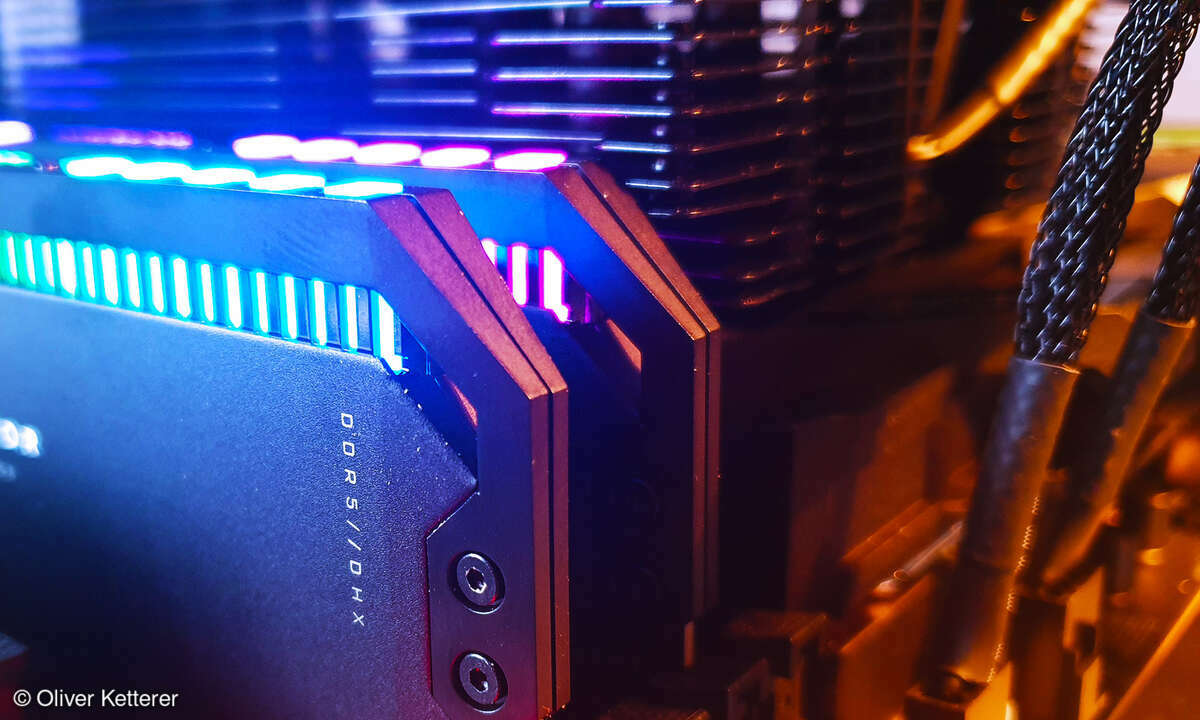 Allerdings sind die Speicherriegel mit rund 58mm Bauhöhe auch relativ hochgewachsen. Das muss man bei der Auswahl des Kühlkörpers berücksichtigen, sonst geht es euch so wie uns: der fette Dark Rock Pro 4 Kühlkörper von Be quiet! geht voll auf Tuchfühlung und lässt keinen Platz für ein zweites Kit an RAM-Bausteinen. Das brauchen wir aber auch gar nicht. Mit einem Kit sind wir ausreichend bedient.