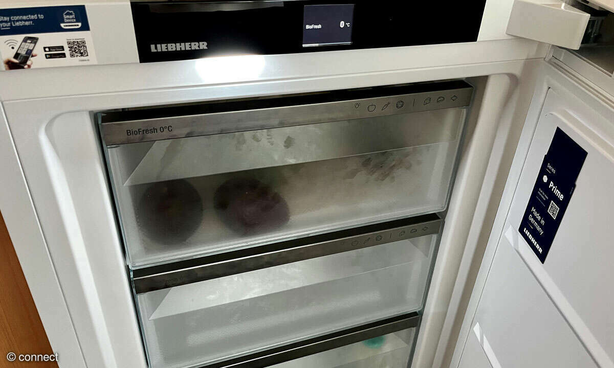 Wer hauptsächlich Obst und Gemüse lagert, kann im Touch-Menü, das bei geöffneter Tür oben im Rahmen zugänglich ist, den HumidityPlus-Modus aktivieren und damit für ein feuchteres Klima in den Schubladen sorgen. Bei verpackten, trockenen Lebensmitteln wie Fleisch, Fisch, Käse oder Milch soll man diesen laut Hersteller deaktivieren.