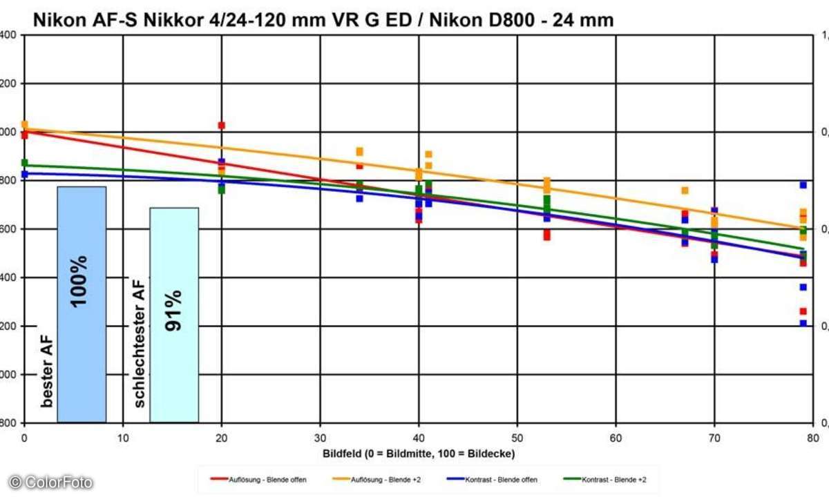 Das Telezoom Nikon AF-S Nikkor 4/24-120 mm VR G ED ist ein Universalzoom mit interessantem Brennweitenbereich, das an der Nikon D800 (Test) vom Fotografen allerdings Kompromissbereitschaft fordert. Vor allem bei offener Blende sinken Schärfe und Kontrast zu den Bildrändern stark ab. Dies bleibt auch abgeblendet so, wenn man von der mittleren Brennweite absieht, die bei Blende 8 ein sehr gutes Resultat liefert. Der Preis von 1.000 Euro ist dagegen eher üppig - keine Empfehlung.