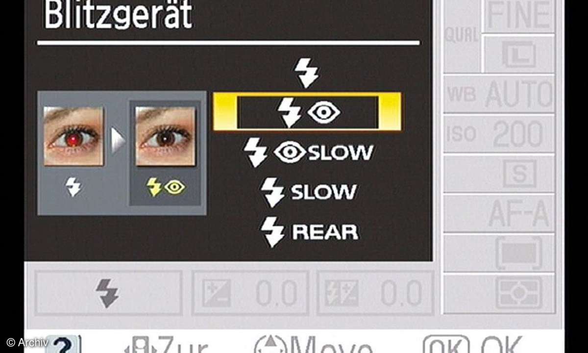 Zugriff auf die wichtigsten Funktionen wie Empfindlichkeit, Weißabgleich, Auflösung, Belichtungsmessung, AF-Modus, Belichtungs- und Blitzbelichtungskorrektur hat man über den Datenmonitor schnell und unkompliziert. Um eine Funktion einzustellen, wechseln Sie zuerst mit der Set-Taste in das entsprechende Menüfenster, um dort eine gelbe Markierung mit der 4-Weg-Taste auf das gewünschte Feld zu schieben. Durch Drücken der OK-Taste gelangen Sie dann in das eigentliche Einstellmenü, in dem Werte durch passende Beispielbilder ergänzt sind. Das ist nicht nur hübsch anzusehen, sondern bringt im Fall der Belichtungs- bzw. Blitzkorrektur auch ein Plus an Einstellsicherheit, weil das angezeigte Bild beim Eingeben von Plus-Minus-Korrekturen tatsächlich heller bzw. dunkler wird.