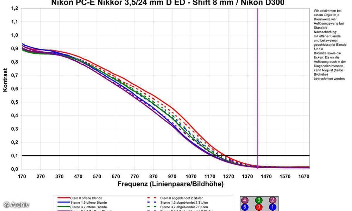 Am kleineren Sensor der D300 macht das 3,5/24 mm eine ausgezeichnete Figur und kann auch geshiftet beste Ergebnisse verbuchen. Offen minimaler Eckabfall, der abgeblendet verschwindet, und akzeptable Vignettierung.