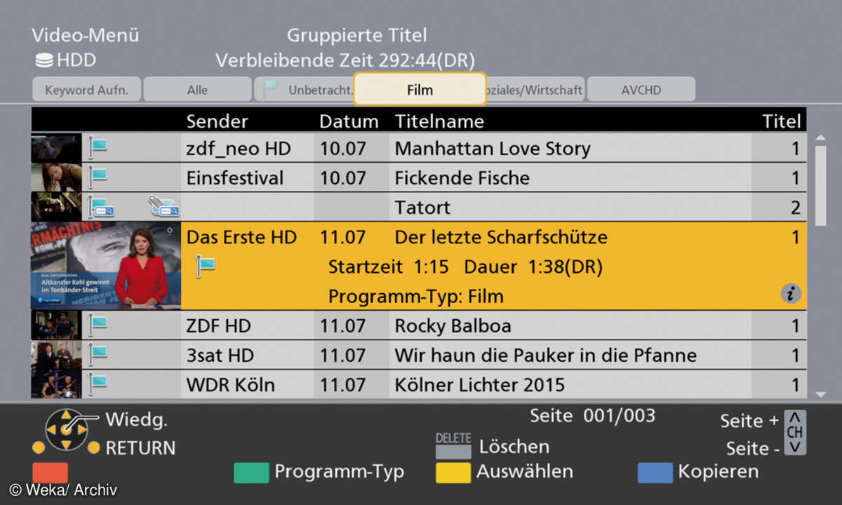 Sobald die Festplatte voll ist, werden erst schon geschaute Sendungen, dann die ältesten gelöscht. Dagegen kann man beliebige Filmhighlights, die man behalten möchte, auch schützen. Leider lassen sich Aufnahmen nicht so einfach auf eine externe Festplatte verschieben, auf beschreibbare Blu-ray-Discs hingegen natürlich schon. Das Archivieren ist ja eine Kernkompetenz von Rekordern.