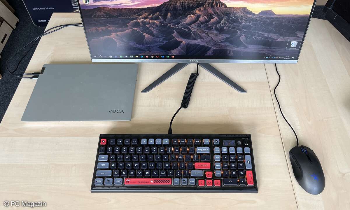 Parallel wird über USB-C das Laptop aufgeladen. Eine clevere Lösung, wobei noch nicht jedes Notebook über USB-C verfügt und die Ladeleistung des PEAQ-Monitors mit 15 Watt recht gering ausfällt. Folglich verlängert sich die Ladedauer.