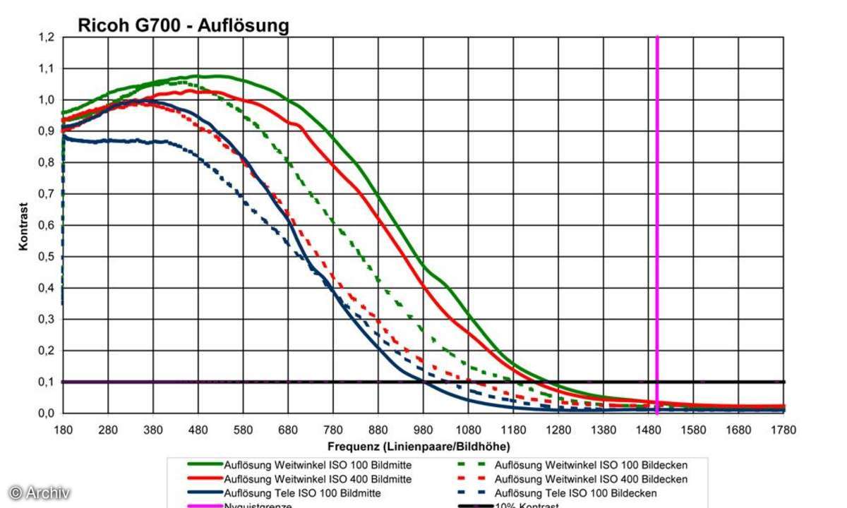 Praktisch auch, dass er eine Wasserwaage einblenden und die Kamera dank großer Tasten mit Handschuhen bedienen kann. Allerdings rastet das Moduswahlrad nicht richtig ein. Außerdem braucht die Ricoh selbst mit schneller SDHC-Karte auffallend lang, um die Aufnahmen zu verarbeiten und abzuspeichern. Der Autofokus trifft bei schwachem Licht nicht immer die richtige Schärfe. Und die Auslöseverzögerung mit AF liegt bei 0,59 bis 0,61 s. Die G700 zeigt im Tele eine deutlich gesunkene Bildqualität, und das Bildrauschen liegt über dem Durchschnitt.