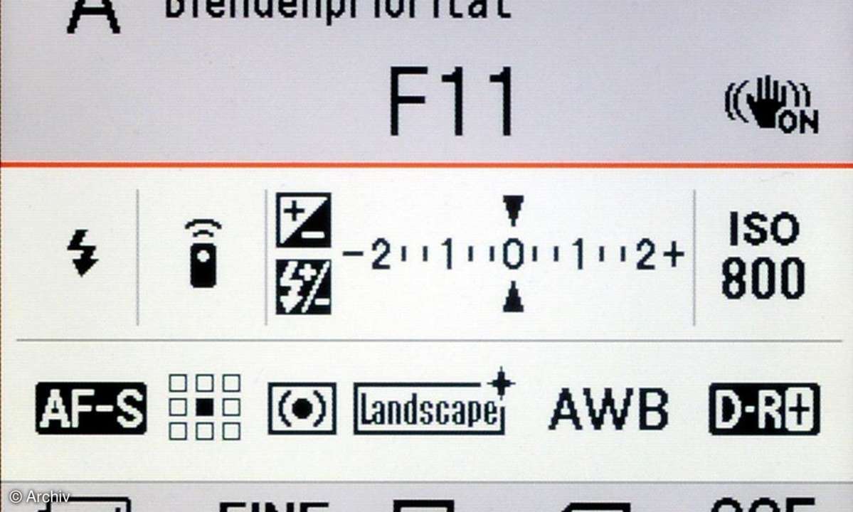 Sehr schön: Die Datenanzeige schaltet zwischen Hoch- und Querformat um. Weniger praktisch: Man hat im Anzeigefenster keinen direkten Zugriff auf Einstellungen. Stattdessen muss man immer den Weg über die dazugehörigen Untermenüs gehen, die man über das Hauptmenü, die Fn-Taste oder Direktzugriffstasten erreicht. Das Hauptmenü ist übersichtlich in Form von vier Registerreitern mit insgesamt sieben Untermenüs organisiert. Die Einträge jedes Untermenüs lassen sich auf einer Seite überblicken, so dass nicht gescrollt werden muss. Zu den Direkttasten gehören die Belichtungskorrekturtaste und die doppelt belegten Tasten des 4-Wege-Schalters. Darunter ist auch die Blitztaste; im dazugehörigen Auswahlmenü lässt sich der gewünschte Blitzmodus einstellen. Wählt man z. B. "Aufhellblitz", wird der Blitz nach Antippen des Auslösers ausgefahren - die sonst übliche Taste zum Aktivieren des Pop-up-Blitzgeräts sucht man vergebens.