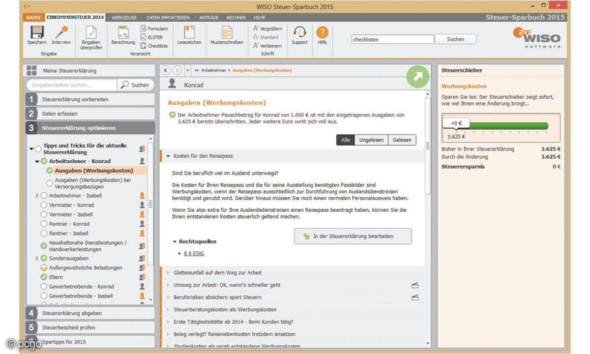Bei den technischen Neuerungen der getesteten Steuersoftware 2015 hat das WISO Steuer-Sparbuch in diesem Jahr die Nase vorn. Nutzer können erstmals selbst bestimmen, ob sie die Steuererklärung am PC, per Webbrowser oder mit der mobilen "Steuer:App 2015" erledigen. Hierfür werden die persönlichen Steuerdaten in der Cloud gespeichert und stehen dann plattformübergreifend zur Verfügung. Das ist vielleicht nicht jedermanns Sache aber ausgesprochen bequem. Die Steuererklärung kann man so kontinuierlich nebenbei erledigen - sei es vorm Fernseher oder im Liegesessel auf der Terrasse.