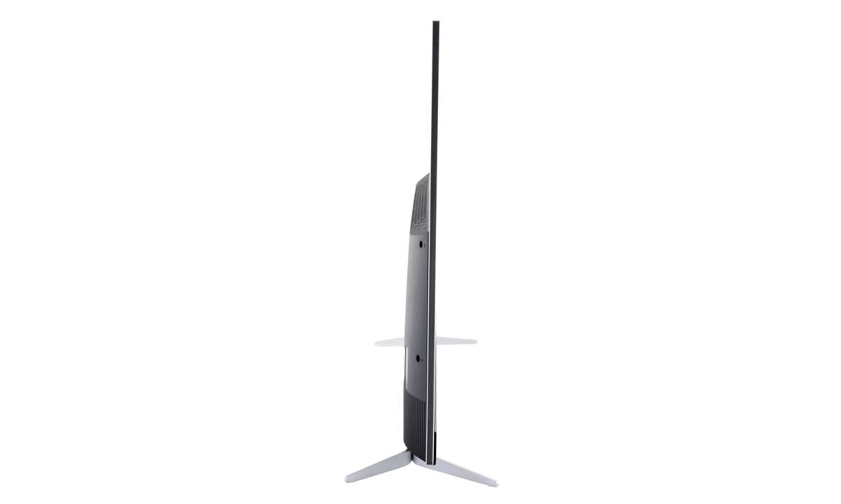 Beim Auspacken zeigt sich sofort, dass dieser in China entwickelte Fernseher in den deutschen Markt drängen will. Er ist das einzige günstige Modell mit ultraschlankem Panel, das in Metall umrahmt auch noch wertig daherkommt – in seiner Preisklasse ist das einzigartig.