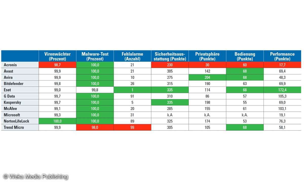 - Gesamtnote: In der großen Tabelle unten finden Sie zwei Noten, denn die Gesamtnote enthält nicht nur reine Schutzfunktionen, sondern auch Bedienung und Performance. Die Aufteilung erfolgt so: Live-Test (20 Prozent), Malware-Protection-Test (Virenwächter, 5 Prozent), Fehlalarme (5 Prozent), Sicherheitsausstattung (10 Prozent), Schutz der Privatsphäre (20 Prozent), Bedienung (20 Prozent) und Performance (20 Prozent).